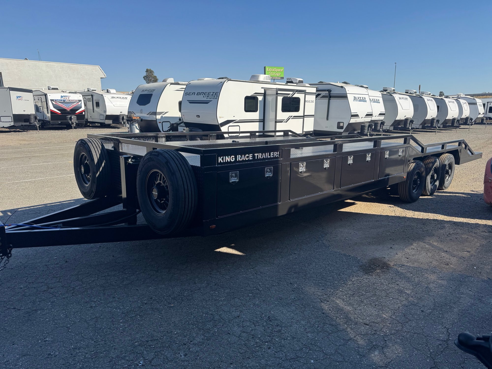 This King Race Trailer 30' Box Out Features flush mount baggage doors, cam latches with built in locks.